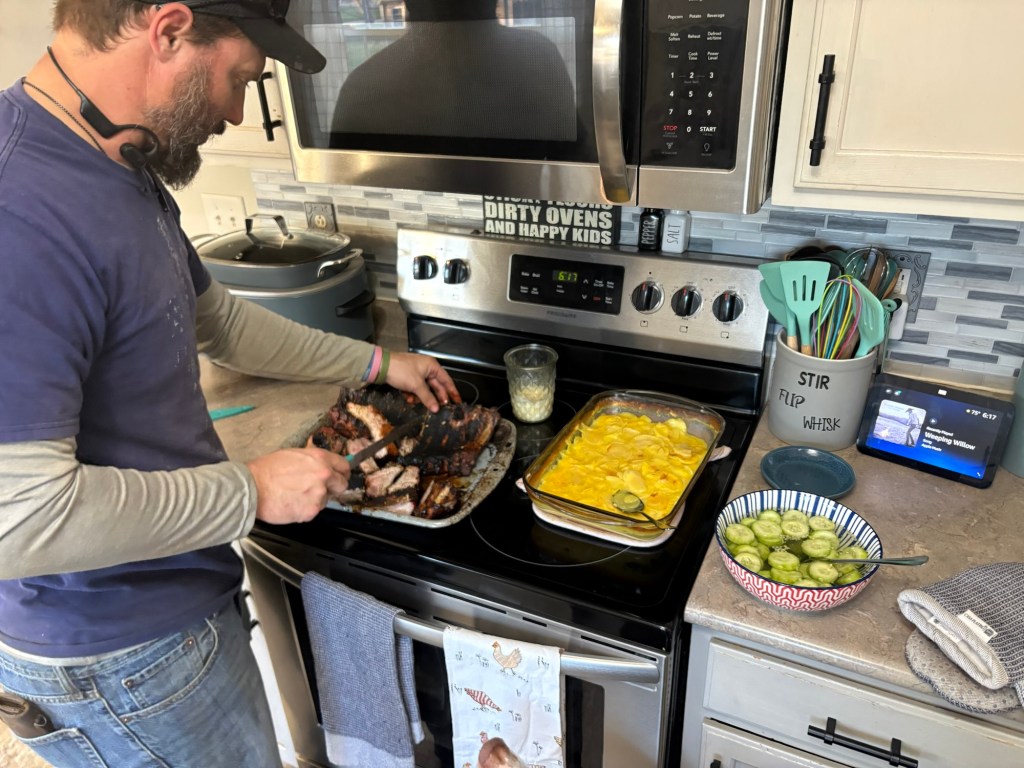 Mikayla left, this morning, headed back to Knoxville. Adam was helping a friend put up fence, today. This evening, he grilled us a couple racks of ribs. I made scalloped potatoes, and cut up cucumber slices in vinegar water with onion. I love it when our meals look so pretty and colorful!