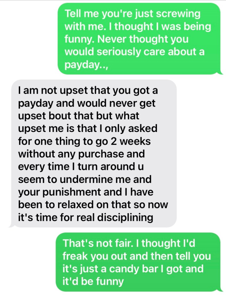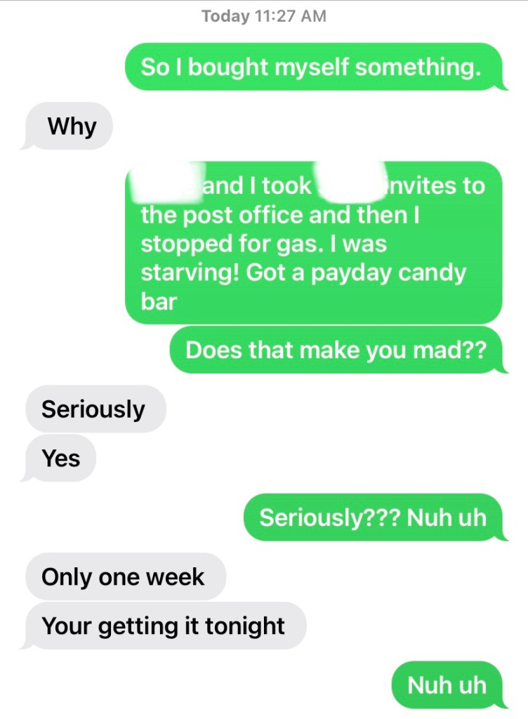 Jackie picked up a worn out ottoman from someone in the neighborhood giving it away. We used some fabric and recovered it last night so it looks brand new. We love to repurpose old things and make them beautiful. Sometimes, sell them and make some money. Sometimes, keep things for ourselves. That’s what we were doing last night in the kitchen when Adam got home. I had enchiladas in the oven and they only had about 5 minutes left. Adam came in and told me “hi boo” and kissed my forehead. We talked about the ottoman we had done and he complimented us on it. Supper was ready so I made up the kids plates and then Jackie and Adam filled theirs. Everybody sat at the table, except for me. I couldn’t eat. When everyone was finished eating, I cleaned the dishes and busied myself in the kitchen. Adam walked in and told me to come with him. I said “I don’t think I want to do that”. He used his man voice and calmly, but sternly told me to get in there, as he pointed to our bedroom. Then he asked Jackie to take the kids out back for a little while. My heart was racing as I walked past him into our bedroom and he shut the door. He asked me to sit down on the bed and I shook my head no. I got the look from him as he repeated himself. He wasn’t asking this time. He was giving an order. I was expecting him to sit down beside me so he could pull me over his lap, but instead, he stood in front of me. He began with the lecture. I honestly can’t remember exactly what he started with, but I know I got asked a lot of questions like “Why are we here?” and “What did I tell you would happen?” I really plead my case, too. I kept repeating to him that I never ever imagined this would be something that “broke the rubber band”! I didn’t think he would care. I honestly thought I was being funny texting him that I’d bought myself something and then telling him it was only a payday candy bar. When five minutes went by without another text from him, I asked him if that made him mad?? I didn’t dream that it would. He told me this is the problem. I don’t take him seriously. He wasn’t exactly happy that I couldn’t understand why it upset him today. He’s been too relaxed and he’s not doing that anymore. We have a walk in closet in our bathroom and he disappeared into it. I started to cry and begged him “Adam, no. Please? You’re scaring me now.” From the closet, he softly replied “I’m not going to scare you. I’m going to help you”. I argued, “I believe you Adam! I understand!” as he walked out, through our bathroom, toward me.
