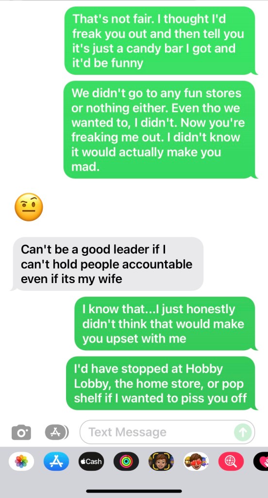 I had seriously considered hiding all of the belts. I even pulled them from the closet a couple of times and then returned them because I was afraid that if he wasn’t going to use one of those bastards, he would if I hid them. I imagined he would see it as being even more disrespectful. Also, I canceled the dish towels I’d ordered even before Adam got home because I figured if a candy bar caused all this, dish towels might be a real bad idea right now. I don’t think I have ever taken my husband more seriously before. I can almost always talk my way out of trouble. Some of the time, I don’t even think I am in the wrong. I tried everything before he got home. I was sweet. I argued my point of view. I even got angry toward the end, when I knew he would be home any minute. My emotions were all over the place. I felt shock, fear, confusion, sadness, anger. I also felt proud of Adam. I do want him to be able to stand up to me. I respect him when he stays calm and I am assured that he still loves me, even right now. He text me and called me “hunny” in one of his messages in our back and forth all day. That simple word included in a text from him told me that, even though he’s upset, he loves me. I’m still his Boo, Hunny, Baby… I feel more safe and loved than ever. I know he isn’t going to hurt me. At least, he isn’t going to hurt my heart. He isn’t going to say anything that damages the trust I have in him. He’s holding onto authority because he isn’t going low and being cruel with the words he’s saying. He’s holding onto authority because he isn’t backing down, either. There’s an older country song that goes “Daddy’s hands weren’t always gentle, but I’ve come to understand that there was always love in daddy’s hands”. I like to think that is Adam, too. Maybe he is upset, but it’s not about taking out his anger on me. It’s about standing firm and never letting me down. Never giving me any doubt that there is love in everything he’s saying and doing. That gives me a security that I can’t describe in words. It means everything to me. I went to sleep in his arms, like any other night. I had a renewed appreciation for my husband. I woke up this morning with a real sense of respect for him. I want to obey. Not just because he can and will pull me over his lap and spank me til I’m sorry! I’d rather not experience that feeling again. At least, not today. But, I also genuinely want to show him that I believe him, and I believe in him. I trust that he means what he is saying. I respect him. I love him forever and a day.