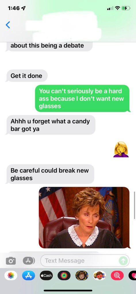 Adam wants me to go into the eye doctor with our son so I can get new glasses. I hardly ever wear them anyway! The ones I have are fine. He told me, when I forgot our son’s appointment, to make myself one too. I don’t need to. He’s being a butthead…
