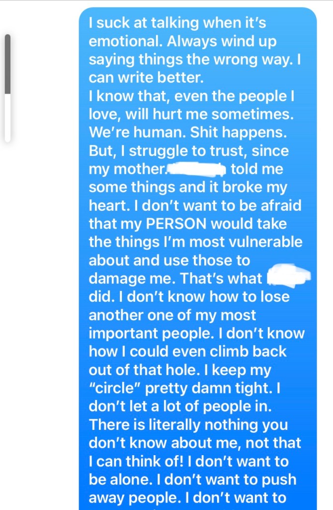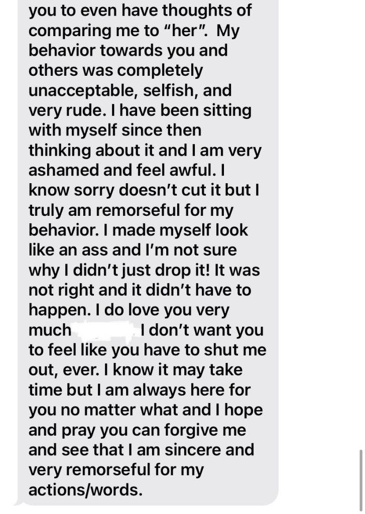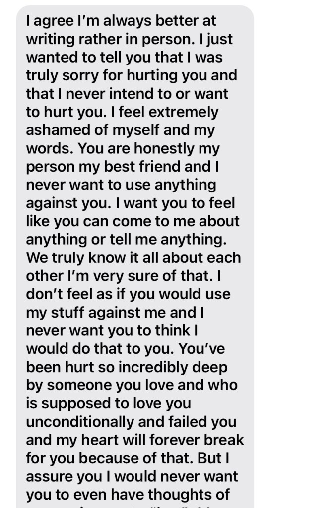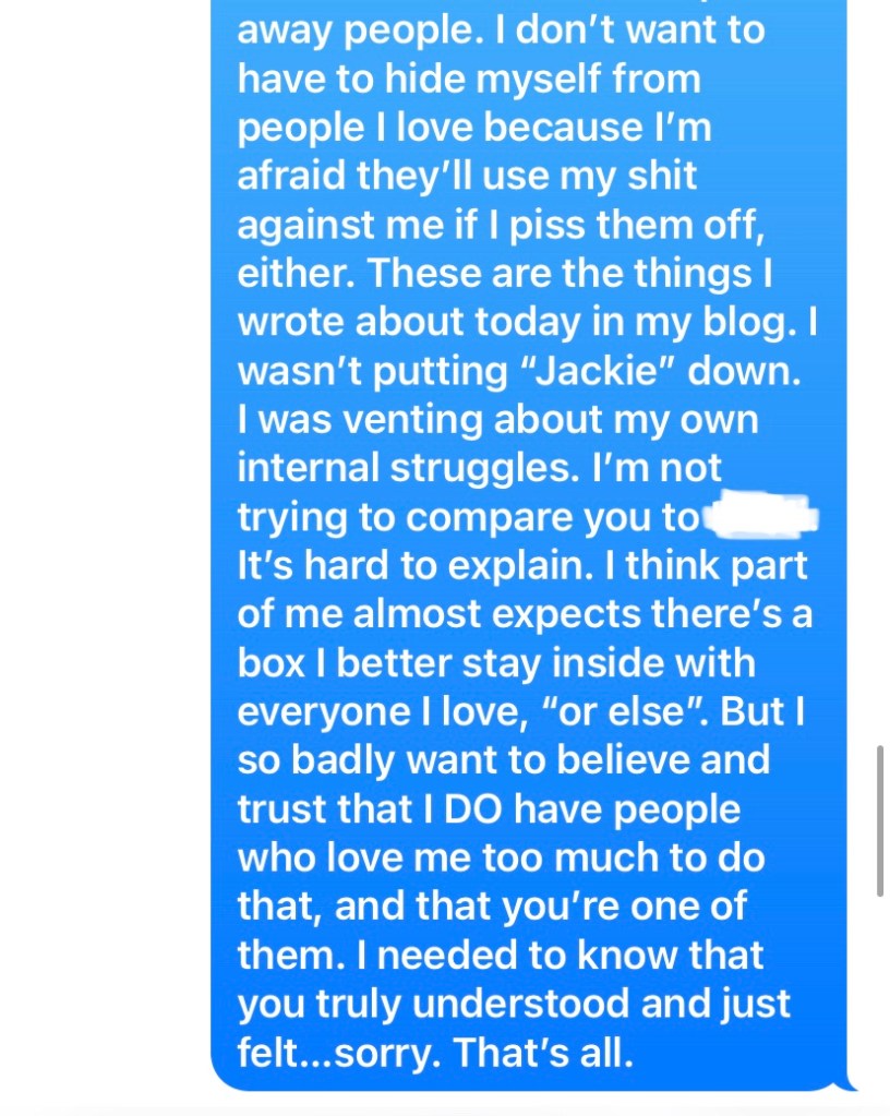 It was hard to choose from the plethora of photos I have with Jackie. Adam is my number 1. But, Jackie is my person. She’s who I go to when I need advice. She’s been with me through even more than Adam has. She took me to the hospital when I was in labor with my daughter. When I say she’s my best friend, I don’t mean that lightly. She is so important to me. I can’t imagine what I would do if she wasn’t in my life anymore. After Adam and my babies, she’s it. I love my Dad, my brother, my sister. I have some great other friends. But, Jackie is the only person who knows all of me, besides Adam, of course. We aren’t shy. There’s literally nothing off limits. You don’t find that kind of friendship everyday. It’s a once in a lifetime type of thing. She means the world to me. I would never just toss that away. It broke my heart to think that my trust could have been betrayed, even in a relatively small way. I know I can be reactive if certain “buttons” are pressed. I don’t believe I was wrong for feeling the way I did. I’m just beyond grateful that Jackie understands what she did and was willing to acknowledge it. My mother never apologized to me. Not once. She would blow up and scream and hit. I would hide somewhere. Eventually, she would act as if nothing was wrong. I would just go with it. That’s not something I’m capable of doing, anymore. I won’t push my upset “under the rug” and pretend it didn’t happen.