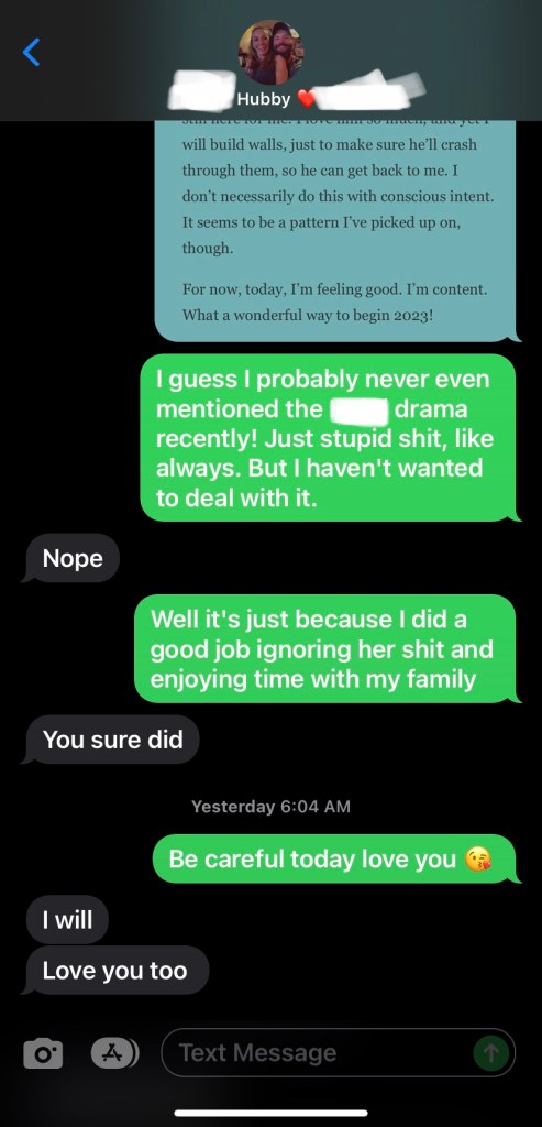 Adam’s been teasing me the last couple of days. He’ll come by and tell me I need a spanking, and then slap my ass a time or two. It doesn’t hurt. He isn’t really serious. Just playing around. I told him, I think he’s getting withdrawals because I’ve been so good! I have really tried hard to lean into all of the happy, the last few weeks. I want to make awesome memories with my people. I want to soak in all of the moments. I think this mindset has also helped me to stay honest and respectful, to Adam. It’s kept me grounded in the things and people who matter most to me. I haven’t had a bad attitude. I’ve embraced the good, and I’ve refused to allow any of the hard stuff “in”. I’m very stubborn. I don’t like to let people hurt me. I get angry with myself, when I have given someone that power. Someone who’s desire was to do exactly what they’ve done…hurt me. The real of it is, my mother has been creating some chaos, recently. I’ve just refused to acknowledge it. Not right now, anyway. I’m realizing that, I act out when I’m feeling overwhelmed, or insecure. Those times when I’m doubting myself, or the people who love me, that’s when I find myself almost “rebellious”. Like, I’m pushing back against my husband, because I need to know that he’s still here for me. I love him so much, and yet I will build walls, just to make sure he’ll crash through them, so he can get back to me. I don’t necessarily do this with conscious intent. It seems to be a pattern I’ve picked up on, though.