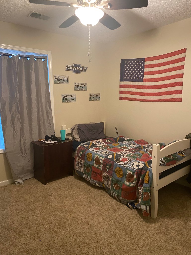 My son got his room looking much better! He arranged it so that it looks nice. Except, I can’t explain why he has the nightstand facing backwards? We got new license plates, awhile ago. He took our old ones, and Jackie’s, and hung them on his wall. Whatever…it’s his room?