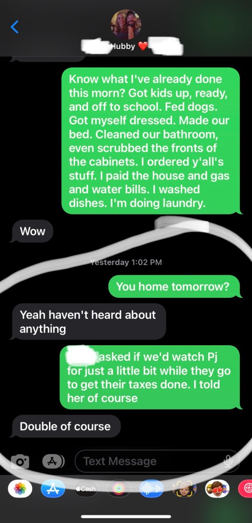 I pay most all of our bills through our banking app, or Apple Pay. For some reason, every once in awhile, something goes wrong. I scheduled one of our utility bills to come out of our account, weeks ago. I didn’t think about it again, until we got a notice that it hadn’t been paid. I went online, scanned all of my scheduled and past payments debited from our main account, and it wasn’t there. I’m still not sure how, but it disappeared. Adam didn’t doubt me, when I told him I know I had scheduled it. What he lectured me on, was not checking to make sure it had come out. This has happened before, several months ago. I agreed, I’m going to have to be more vigilant about double checking, but I didn’t feel like it was fair to get punished. Adam disagreed. He wasn’t grouchy, when he got home. We ate supper. I cleaned the kitchen. Jackie and I talked, for awhile. Adam came in, around 8:30pm, and asked me if I was ready to go take a shower. We walked into our room, and he announced, “Alright, let’s get this over with.” I protested! He swatted my butt a couple of times. It didn’t even hurt that bad. I was angry, though. I looked up at him and asked, “Are you done yet?!” He said, “Apparently not.” I refused to surrender, this time. I was mouthy. I wouldn’t give him the yes sir, he was looking for… I couldn’t begin to guess how many times his hand connected with my behind, before I finally gave in. I was struggling to contain the tears trying to escape from my eyes. Adam’s voice softened. His hands gently held onto me. He told me that, this hurts him too. Believe me, I wanted to say something snarky, but I held back.