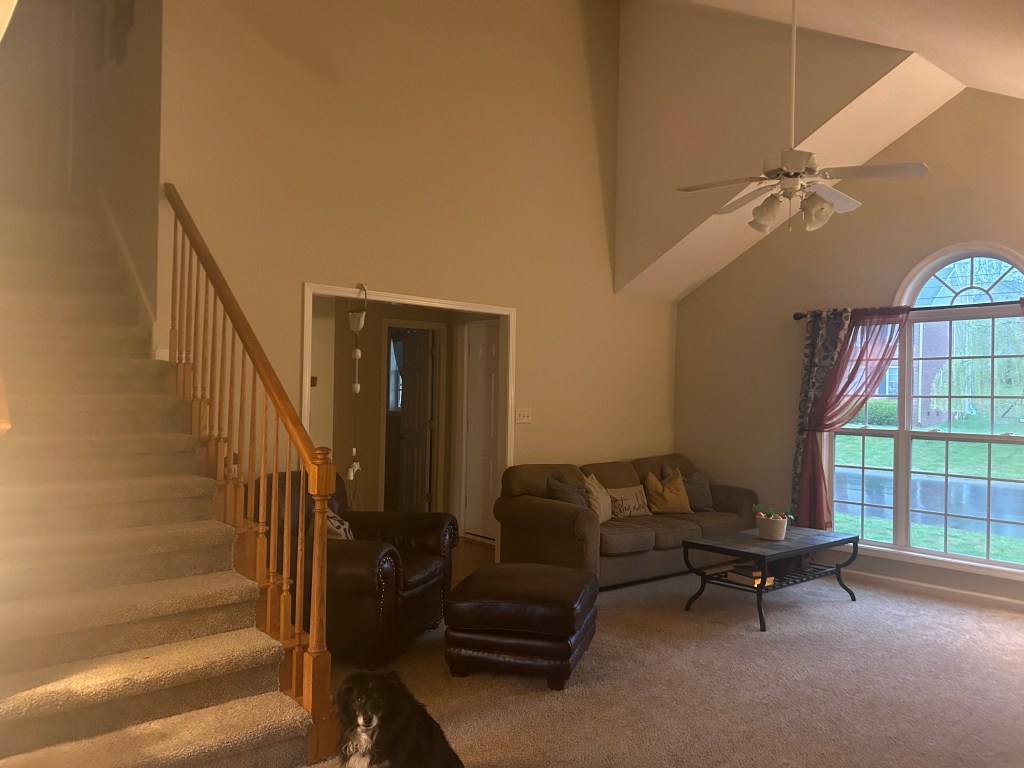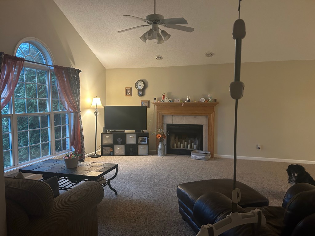 I was sending pictures of our living room, to a friend. I’m trying to come up with ideas for the walls. I’d like to paint that wall, where the big window is. Make it an accent wall. I’m thinking of a mustard yellow kind of color. I also have some other things I’d like to change. I hate our ceiling fan, in there. I’d like to stain our stair railing and fireplace mantle darker, too. Diesel kept photo bombing my pictures, though 😆