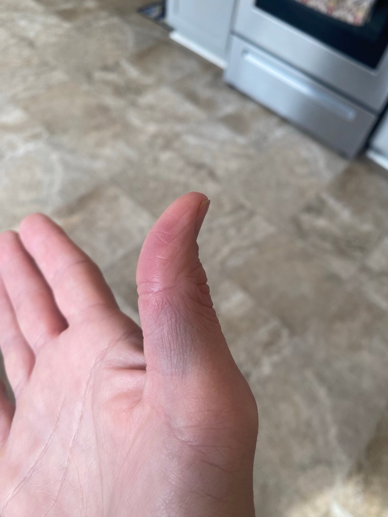 That big ol’ bruised thumb there, is from attempting to block Adam’s hand from connecting with my behind, last night. Not wise. I know better. He had held my arms out of the way, and swatted me a few times. We were just getting ready to take our shower, and after he’d spanked me, I was kind of ignoring him. He said something to me, and my response was snarky. He spun me around, to face him, and knowing what was coming, I threw my hand behind me. My finger is fine, just swollen and bruised.