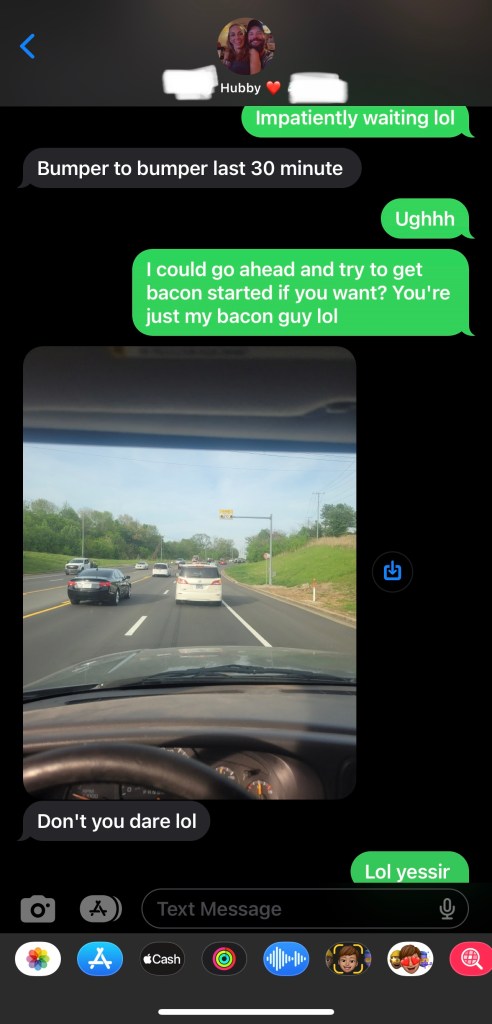 Thankfully, what I do have, is some amazing people who are here for me. While it’s impossible to replace the missing piece my mother has taken, my life is very full. I’m blessed with a whole lot of love and support. We had a great evening, with Justin and Jackie. We sat out on the deck, enjoying the beautiful weather, and a couple drinks. Adam was running a little late, so I’d offered to go ahead and start the bacon, for our BLT’s. This was his response,