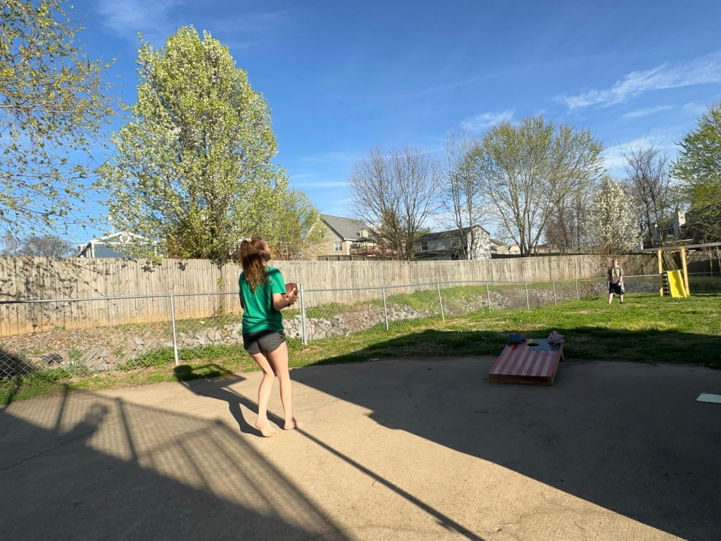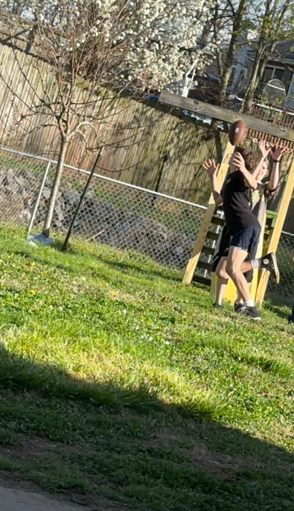 Justin came over, and helped my boys load up the remnants of the evergreen tree. They took it away, and went for a stump grinder. Jackie and I went to the store. We got all the stuff for sides, to go with the ribs Adam was grilling later. We all played cornhole, for awhile. Then, while the boys got the grill started, I threw the football with my kids and a few of their friends. We also set up the volleyball net, and decided bad minton would be fun to play. The boys ran to a Dick’s Sporting near us, and grabbed some badminton rackets and birdies, for us. We played badminton until supper was ready. Everything was delicious!