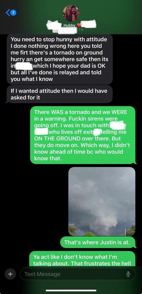 I got annoyed with Adam, when everything first began to kick off. He wouldn’t listen to me, and go get to somewhere safe, during the first tornado warning… Why are men like this?!