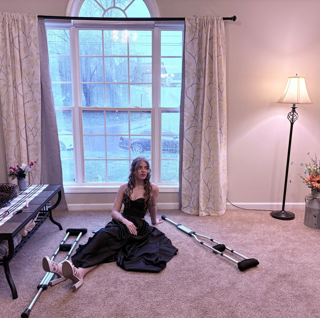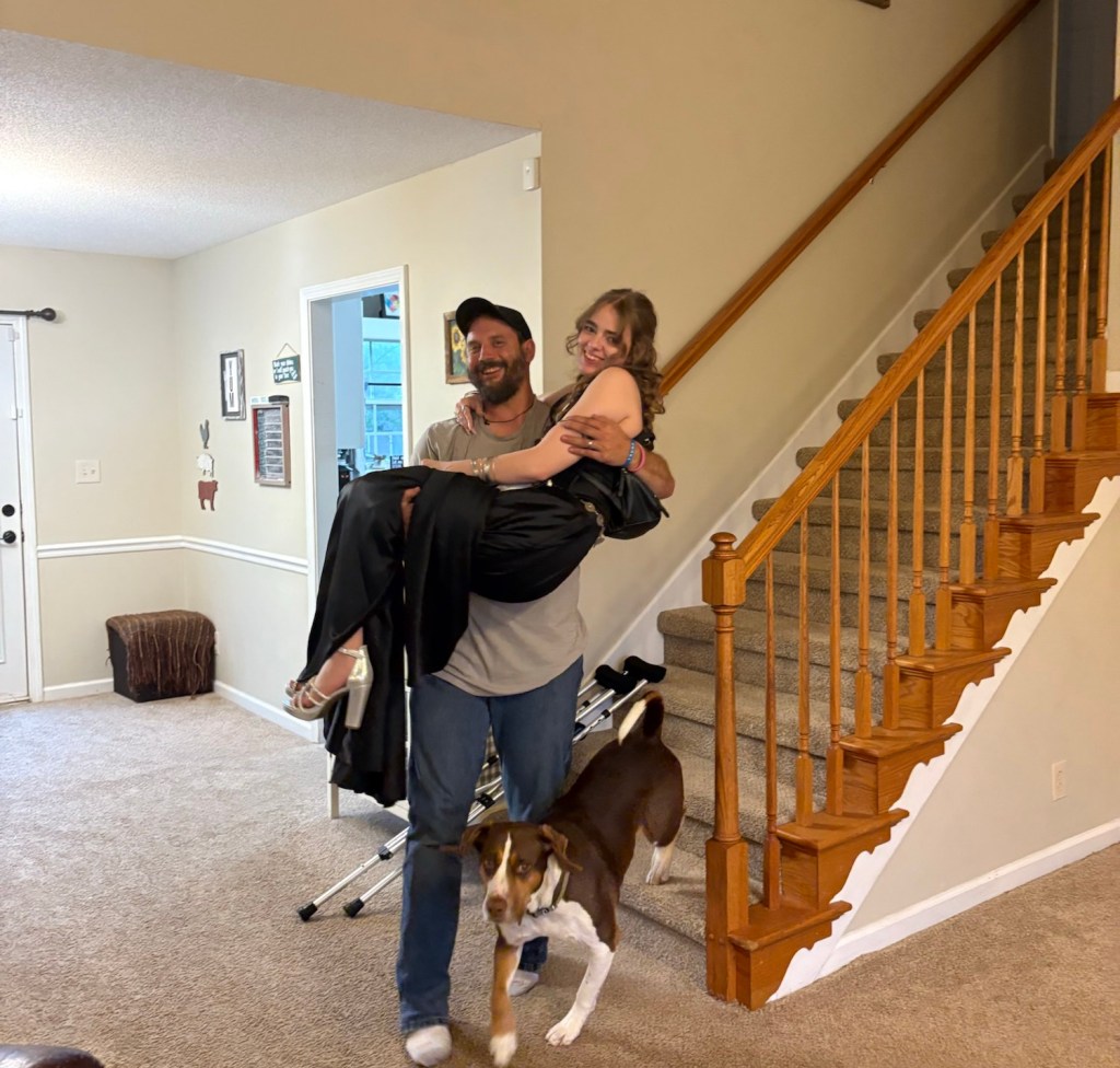 Last Spring, I was actually starting to look into finding myself a new car. But then, our lives changed so dramatically, that purchase just didn’t make sense anymore. I’d intended to wait until we’ve gotten through all the legal mess with Adam and his son. I wanted to get past it, and then use the following few months to save some money up, before revisiting any car dealerships. The same week that we paid the IRS a large chunk of money, we paid an attorney almost $10k. Then, we took our Kansas trip, which needed to happen. Although it was enjoyed by everyone, it wasn’t just a fun vacation. We needed to go see Adam’s mom. Our time with her is so limited, there simply isn’t the option of waiting until it’s a “good time” for us to go on a trip. And then, our first day back home, my car gets wrecked. Badly. I’m not sure whether it’s from the accident, or because of the tension and anxiety I’m having, but I’ve been very sore. The day it happened, I felt perfectly fine, physically. It started the next morning. I had a headache, and my neck and shoulders ached. By the following day, the pain had also migrated further down, into my back and sides. It’s worst on my right side. It feels like a deep bruise around my ribs there. I’m positive there’s no broken ribs. I’ve had broken ribs 3 separate times in my adult life, so I know well the pain of that. I cried out when Adam wrapped his arm around me, squeezing against my right side with his hand. He wasn’t rough with me, and had no idea I’d even been hurting. I hadn’t mentioned it to him. Both of us were caught by surprise, when I reacted the way I did! Thank God, my Brooklyn is doing great, and hasn’t had any problems from our accident. Her 6 week appointment, with her surgeon, was the day after the accident. She is now able to begin physical therapy, and has some exercises to do everyday at home. She can walk with only one of her crutches. Her surgeon wants her to put just half her weight onto that knee, for two more weeks, while she works to build up the muscle mass that’s been lost in that leg. I took a picture of her legs, side by side. It’s incredible how stark the difference is between them, now. She literally can’t just take off walking, like normal, because her leg isn’t strong enough to hold her up without support.
