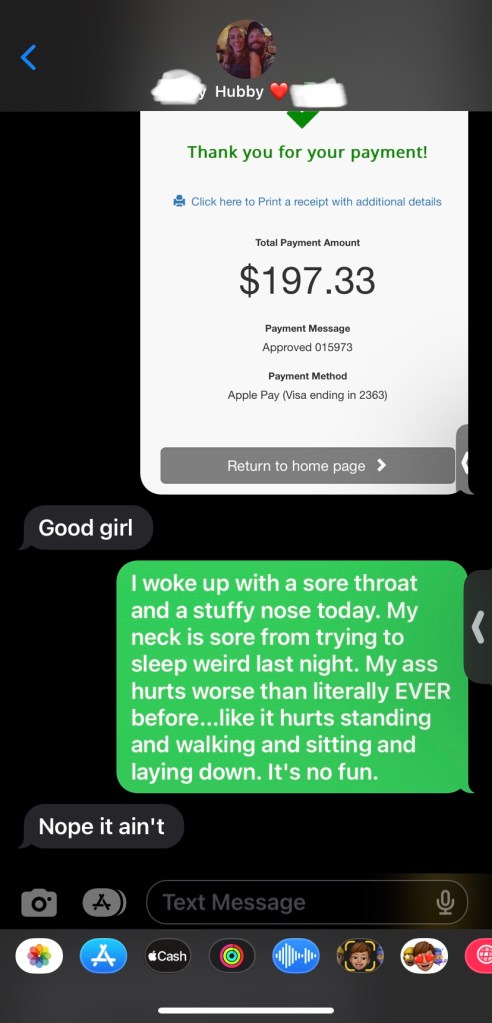 I didn’t sleep well, last night. I couldn’t get comfortable, no matter what position I tried. My butt ached. I’d lay on my belly. My neck didn’t appreciate that. It was a long night, tossing and turning. Adam asked me, this morning, how I slept? I just groaned, because I knew that he knew I’d been rolling around, all night. He leaned over, kissed my forehead, and told me he loved me.