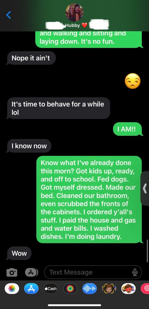 I pay most all of our bills through our banking app, or Apple Pay. For some reason, every once in awhile, something goes wrong. I scheduled one of our utility bills to come out of our account, weeks ago. I didn’t think about it again, until we got a notice that it hadn’t been paid. I went online, scanned all of my scheduled and past payments debited from our main account, and it wasn’t there. I’m still not sure how, but it disappeared. Adam didn’t doubt me, when I told him I know I had scheduled it. What he lectured me on, was not checking to make sure it had come out. This has happened before, several months ago. I agreed, I’m going to have to be more vigilant about double checking, but I didn’t feel like it was fair to get punished. Adam disagreed. He wasn’t grouchy, when he got home. We ate supper. I cleaned the kitchen. Jackie and I talked, for awhile. Adam came in, around 8:30pm, and asked me if I was ready to go take a shower. We walked into our room, and he announced, “Alright, let’s get this over with.” I protested! He swatted my butt a couple of times. It didn’t even hurt that bad. I was angry, though. I looked up at him and asked, “Are you done yet?!” He said, “Apparently not.” I refused to surrender, this time. I was mouthy. I wouldn’t give him the yes sir, he was looking for… I couldn’t begin to guess how many times his hand connected with my behind, before I finally gave in. I was struggling to contain the tears trying to escape from my eyes. Adam’s voice softened. His hands gently held onto me. He told me that, this hurts him too. Believe me, I wanted to say something snarky, but I held back.